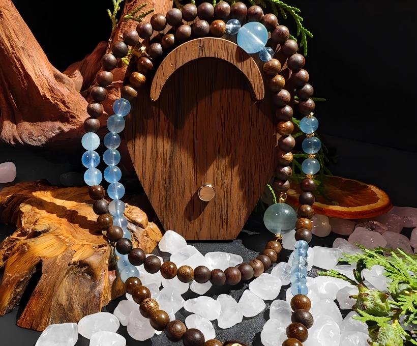 Light a small piece of agarwood or sandalwood incense. Hold the necklace so the Fluorite passes through the smoke (clarifying the mind), the Aquamarine through the rising scent (inspiring the voice), and let the Agarwood beads absorb it (anchoring the prayer). Whisper: “Mind clear, heart brave, spirit grounded. My voice is true.”