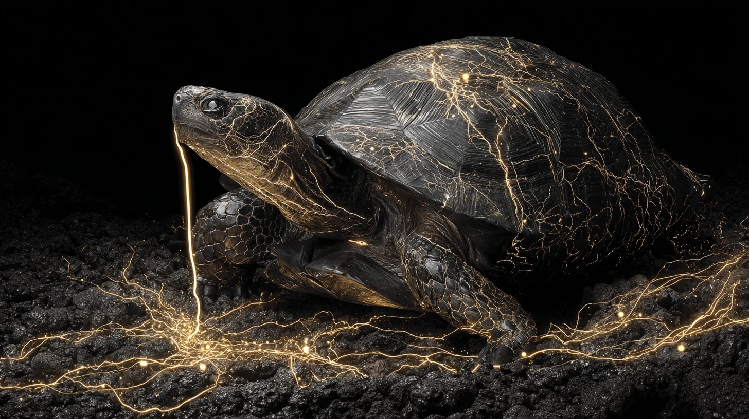• Eastern Allegory: This is the “Black Tortoise‘s Golden Geomancy Needle” (玄武点金针). The Black Tortoise (Xuanwu) of the North is not passive; it is the master of foundational power and hidden treasures. From its union with the earth‘s golden veins, it draws forth “geomancy needles”—tools that locate and activate subterranean currents of wealth and opportunity. These rutile threads are those “Golden Needles,” allowing you to tap into and direct the deep, fertile energies of the Earth to build, create, and prosper. It provides the “Rou” (adaptable, directed force).